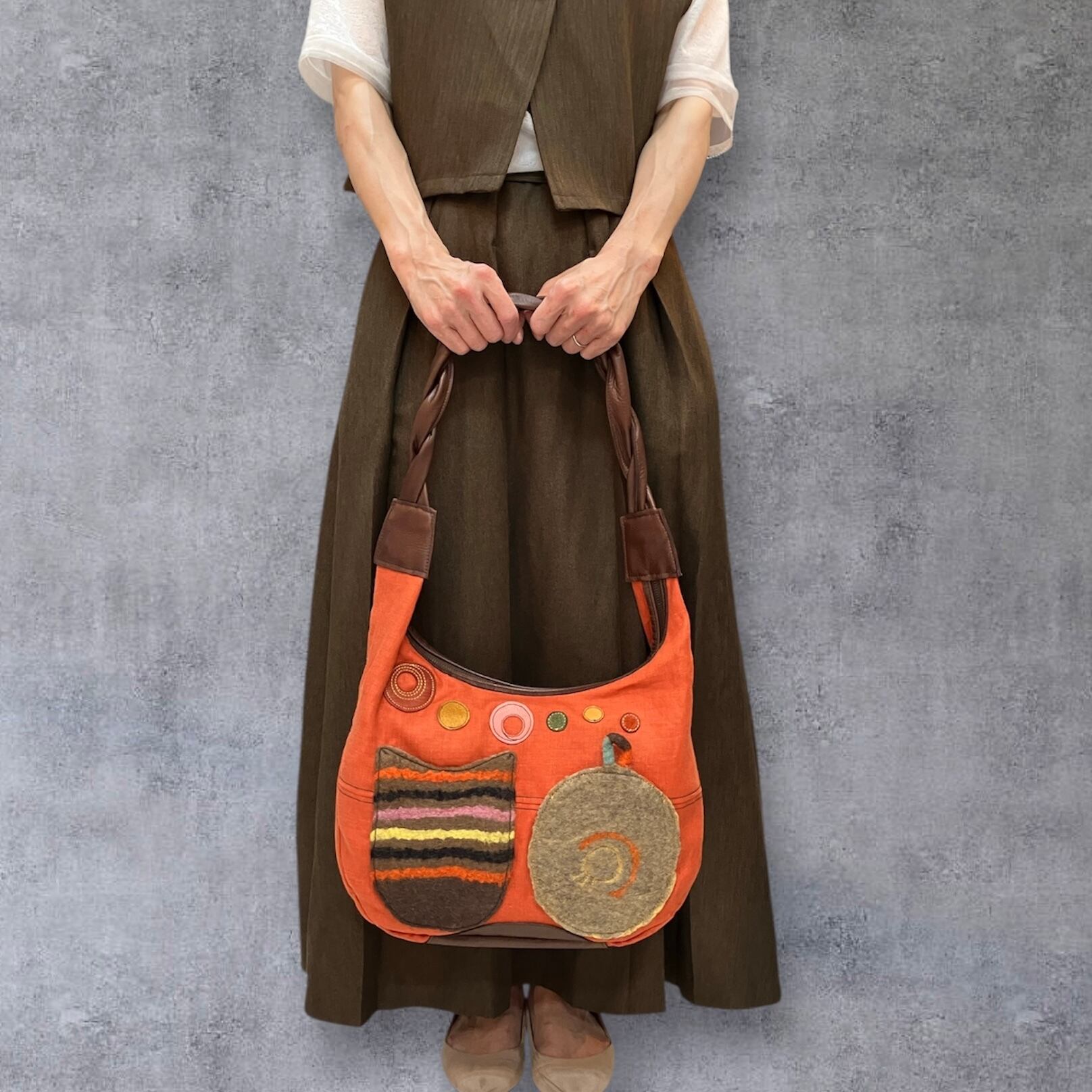 ウールフェルトとコットン生地、牛革の組み合わせで作られた、軽くて持ちやすいバッグです。