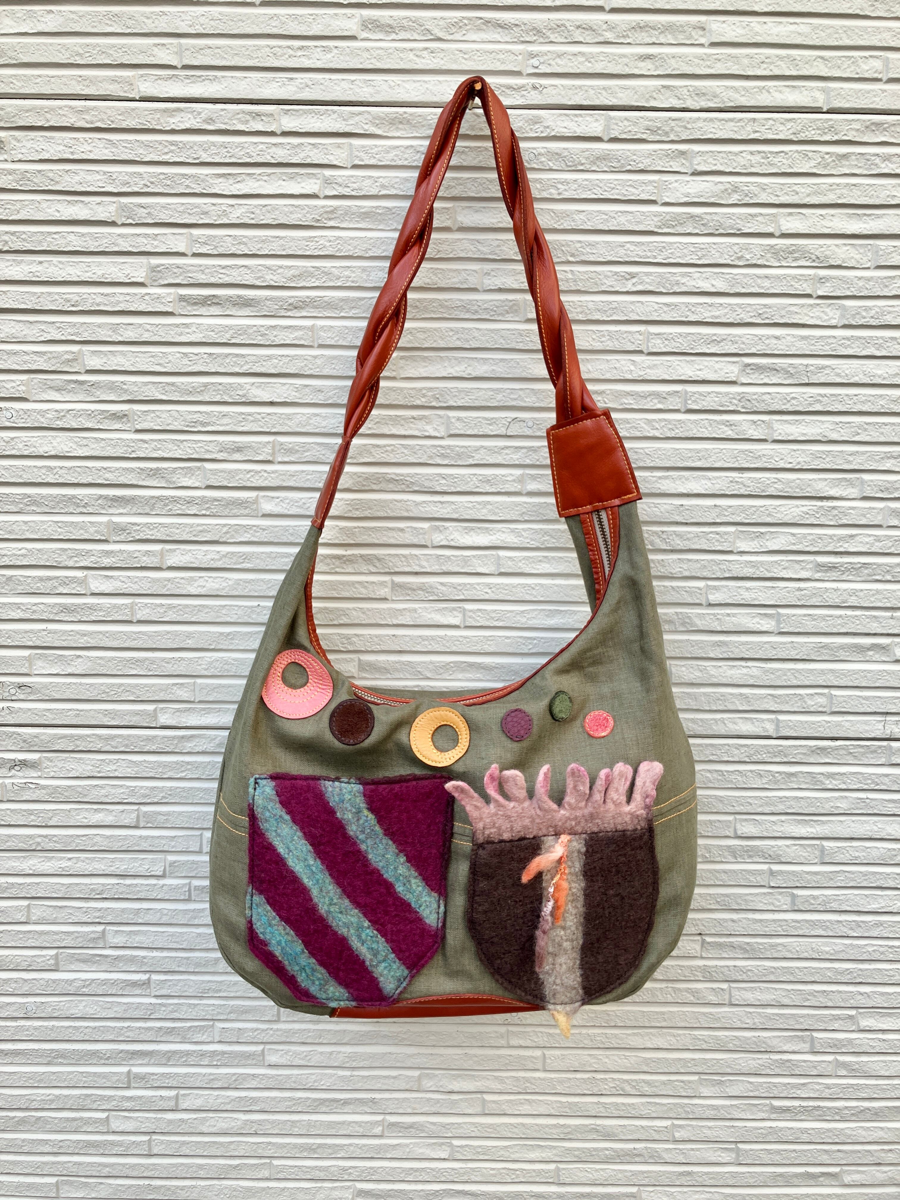 ウールフェルトとコットン生地、牛革の組み合わせで作られた、軽くて持ちやすいバッグです。