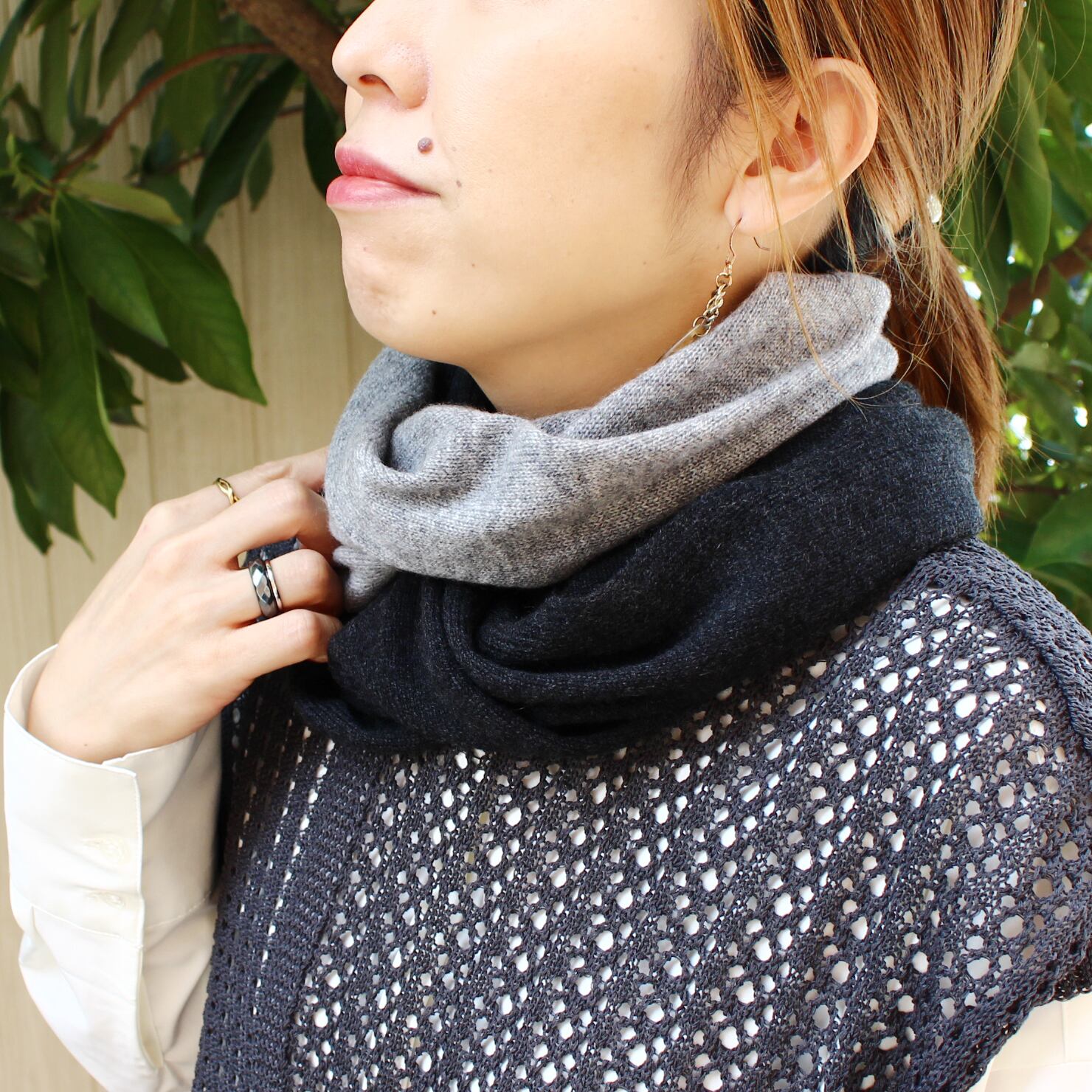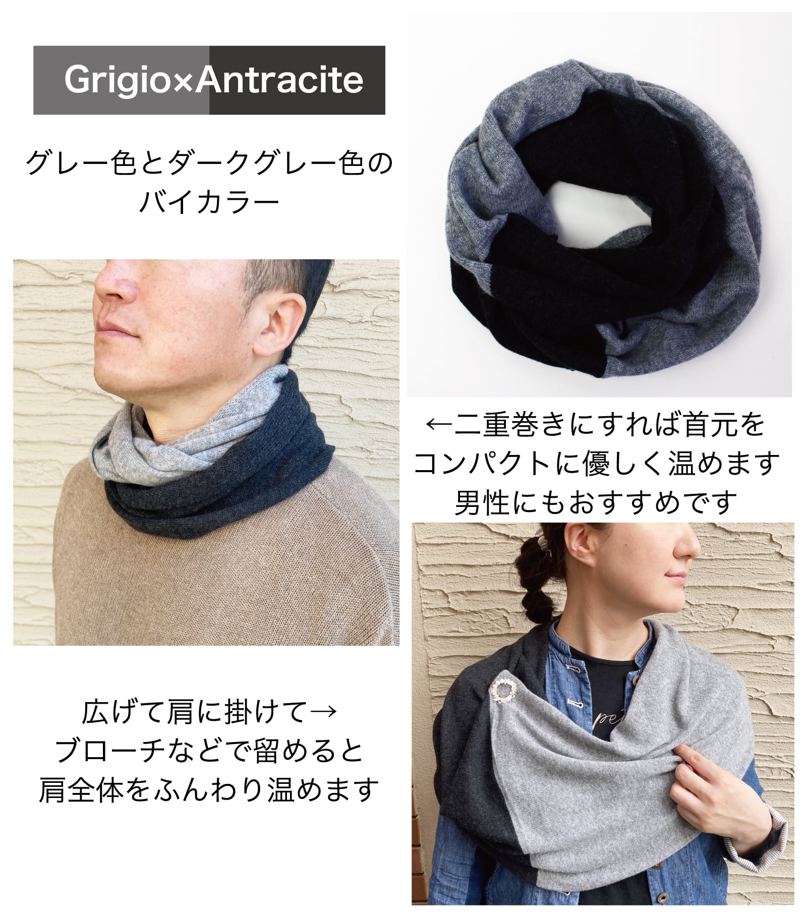 首元に二重巻きにしても暖かいですし、広げて肩にかけてケープの様にもお使いいただけます。