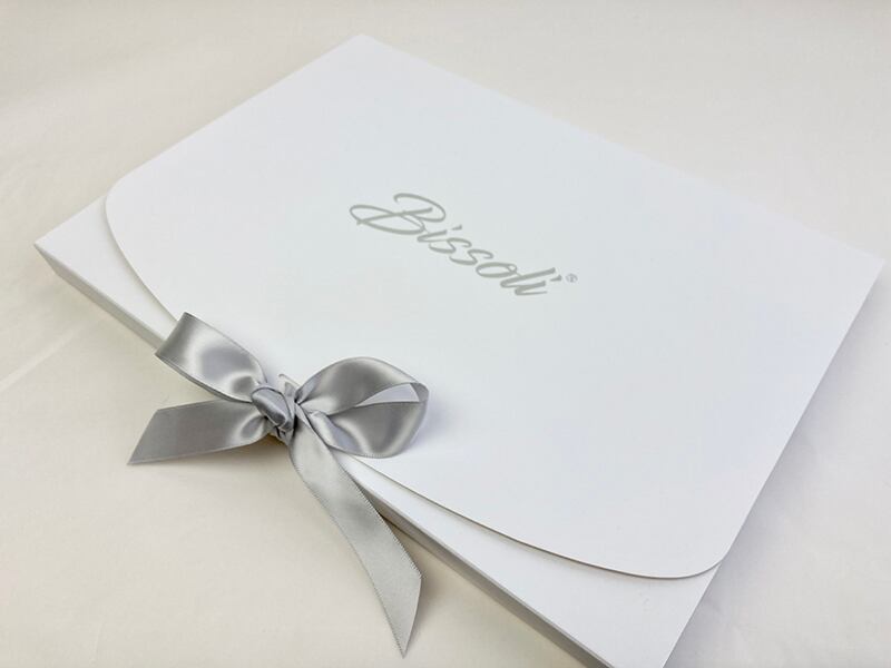 白いボックスに"Bissolli"のロゴが銀の箔押しで入っており、プレゼントにもぴったりです。