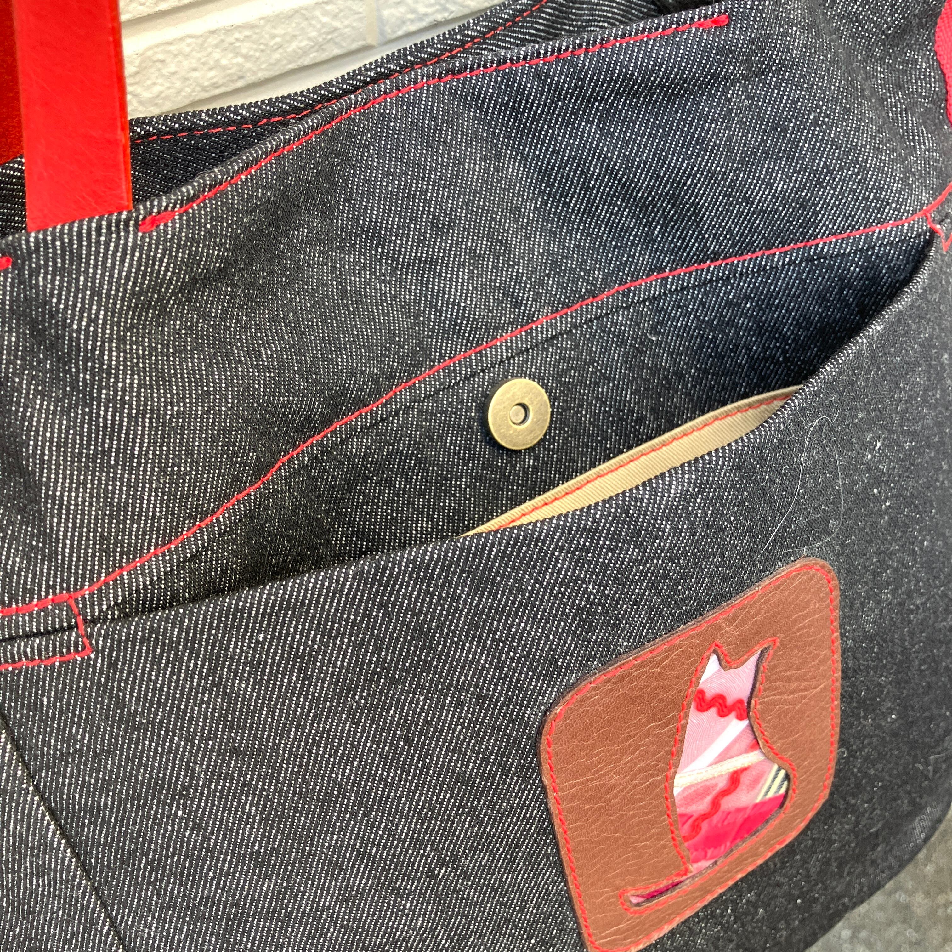 丈夫な帆布生地に、ブッテーロの鮮やかな赤い革とのコントラスト。そして猫のプリントで、お出かけが楽しくなること間違いなし!のバッグとなっております。