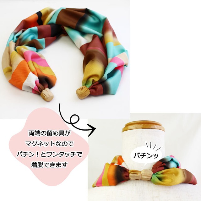 留め具がマグネットになっている、簡単ワンタッチスカーフです。
